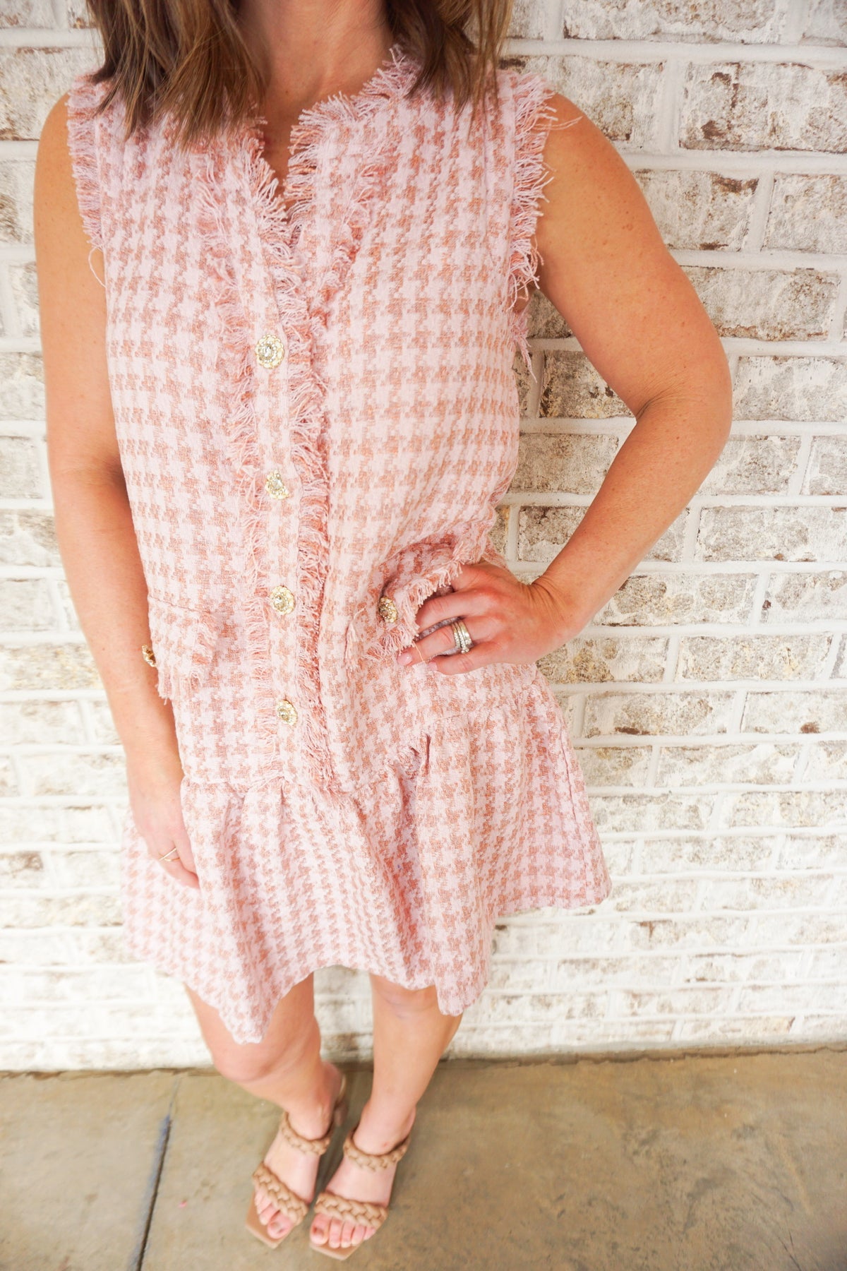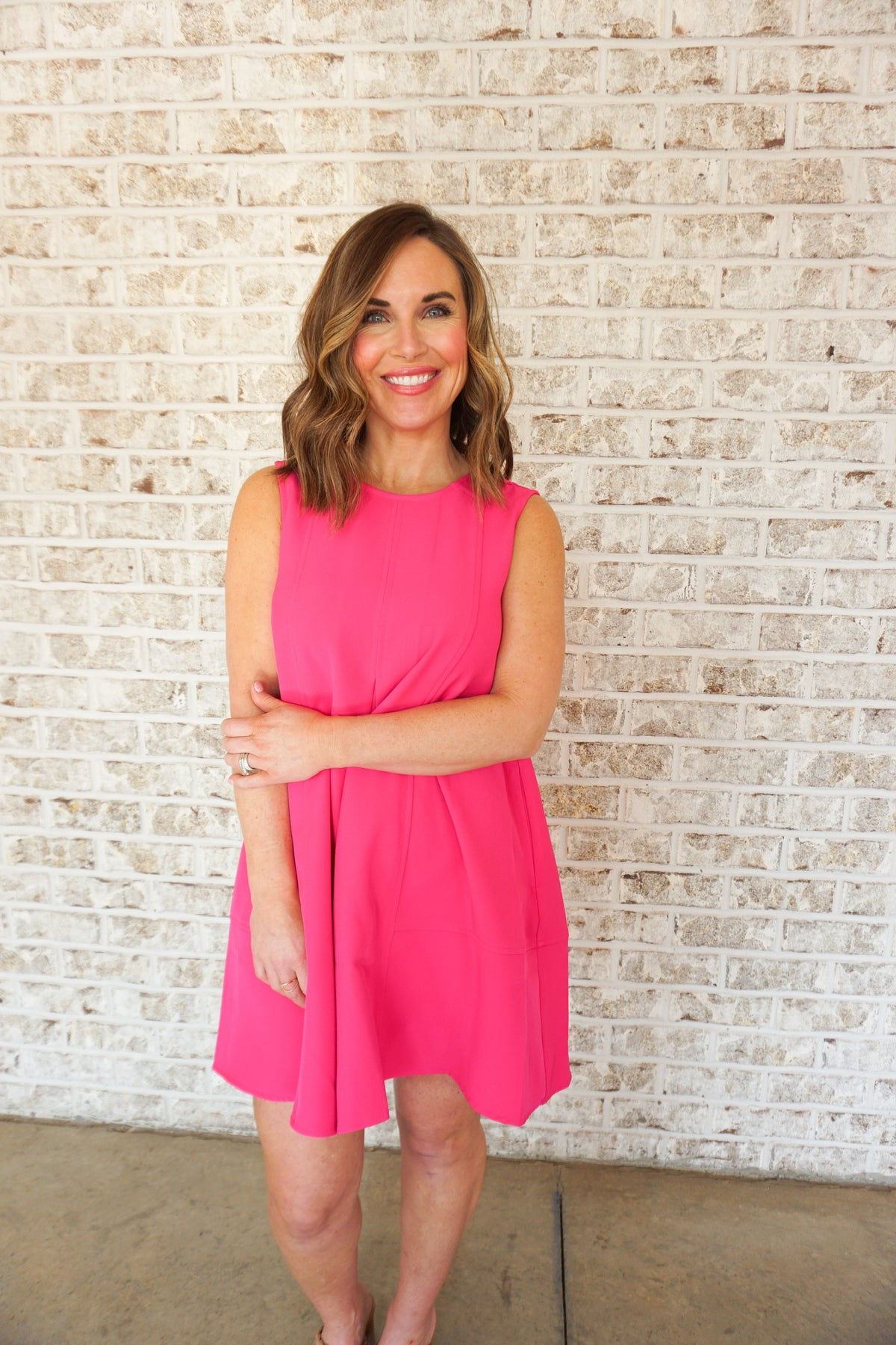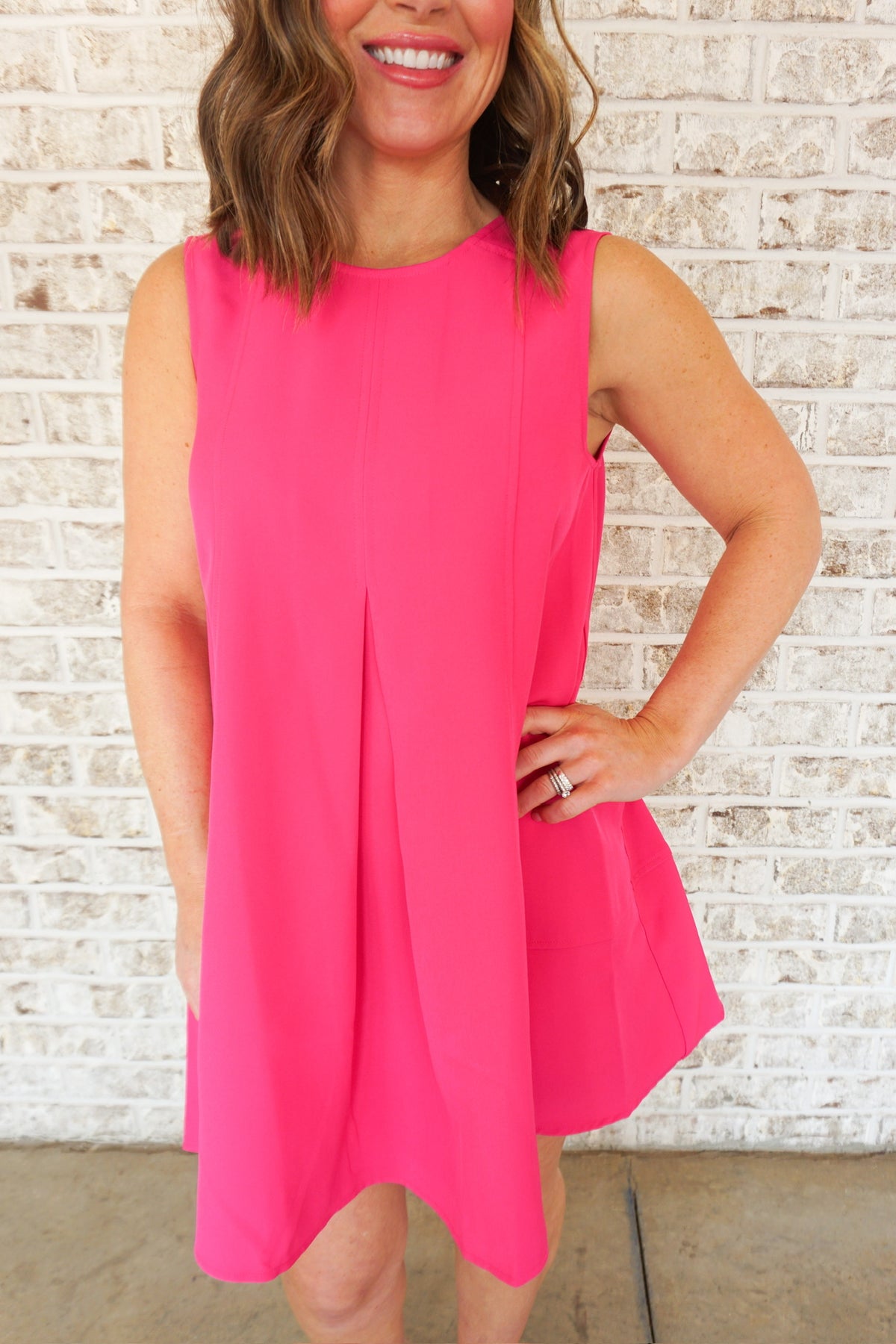 Turn heads in this stunning hot pink mini dress that effortlessly transitions from day to night. The classic round neckline and sleeveless silhouette offer timeless elegance, while the expertly pleated skirt adds sophisticated movement and dimension. Perfect for date nights, parties, or any occasion where you want to make a bold statement. This versatile piece pairs beautifully with heels, sneakers, or boots, giving you endless styling possibilities. Slip into confidence and let your style shine.