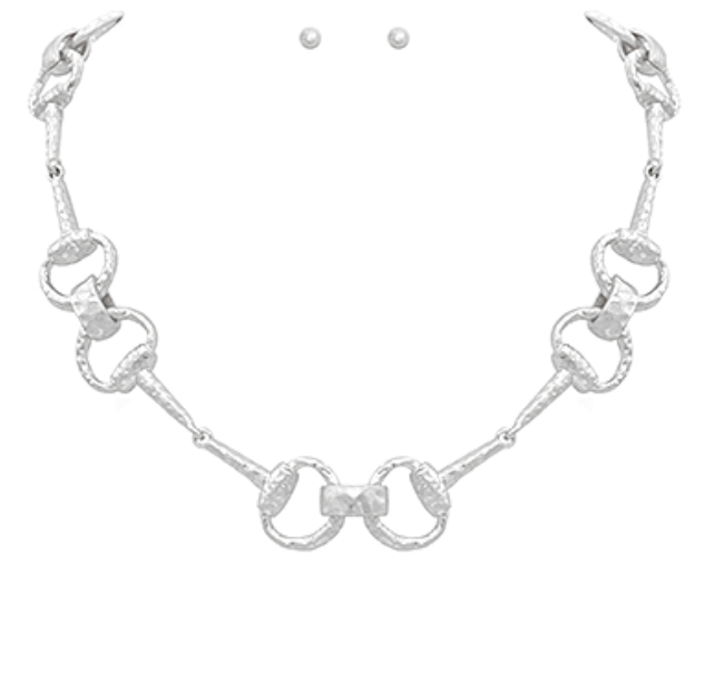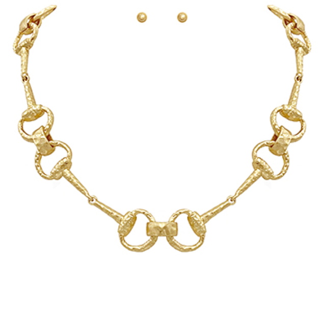 Elevate your jewelry collection with this stunning Linked & Textured Horsebit Necklace Set. Featuring the iconic horsebit design with intricate texturing, this versatile set combines timeless elegance with contemporary style. The linked construction creates a dynamic visual interest that catches the light beautifully, while the classic horsebit motif adds a touch of sophisticated charm. Perfect for layering or wearing individually, this set offers endless styling possibilities for both everyday wear and special occasions. Invest in jewelry that transcends trends and becomes a cherished staple in your wardrobe.