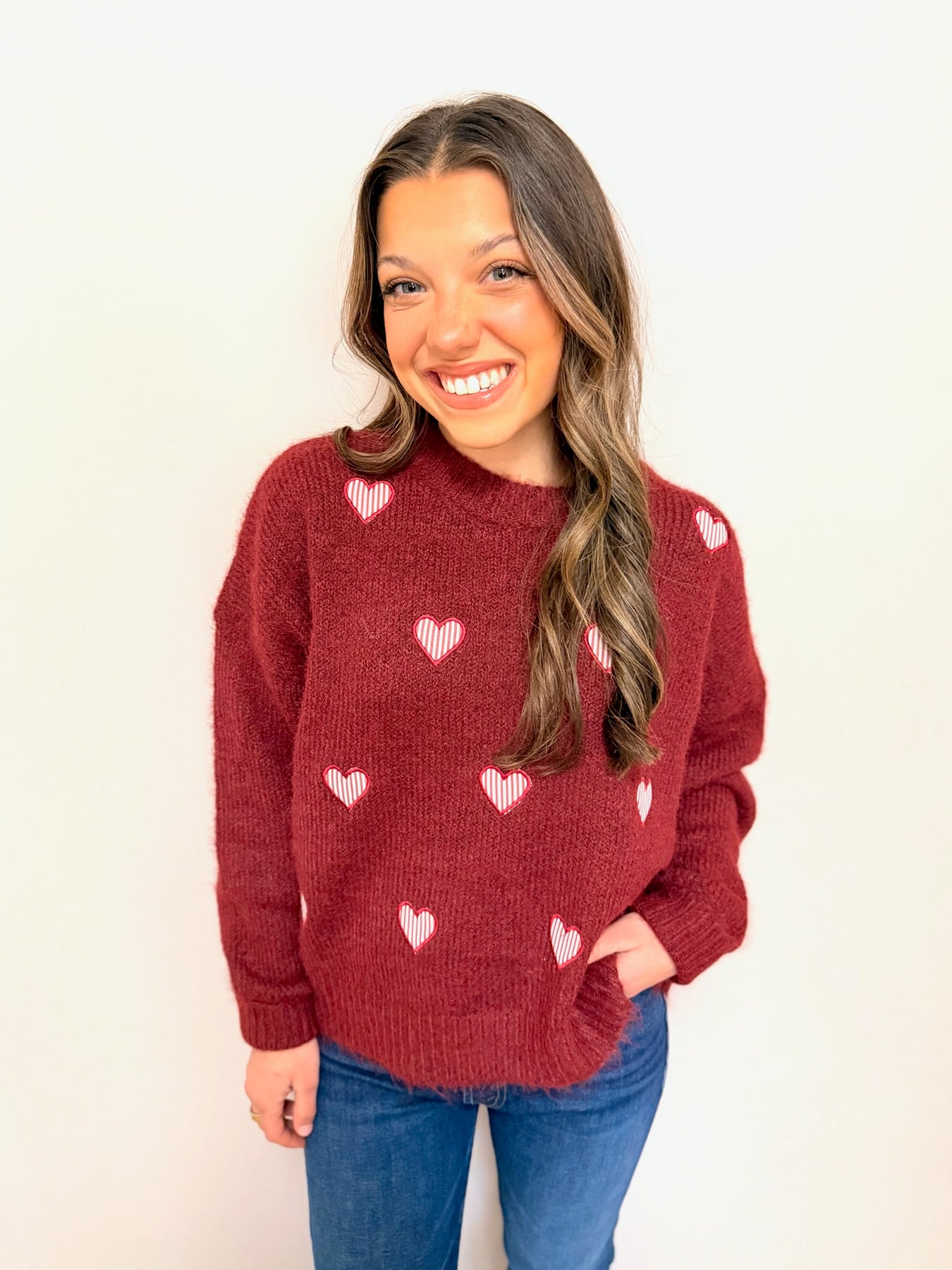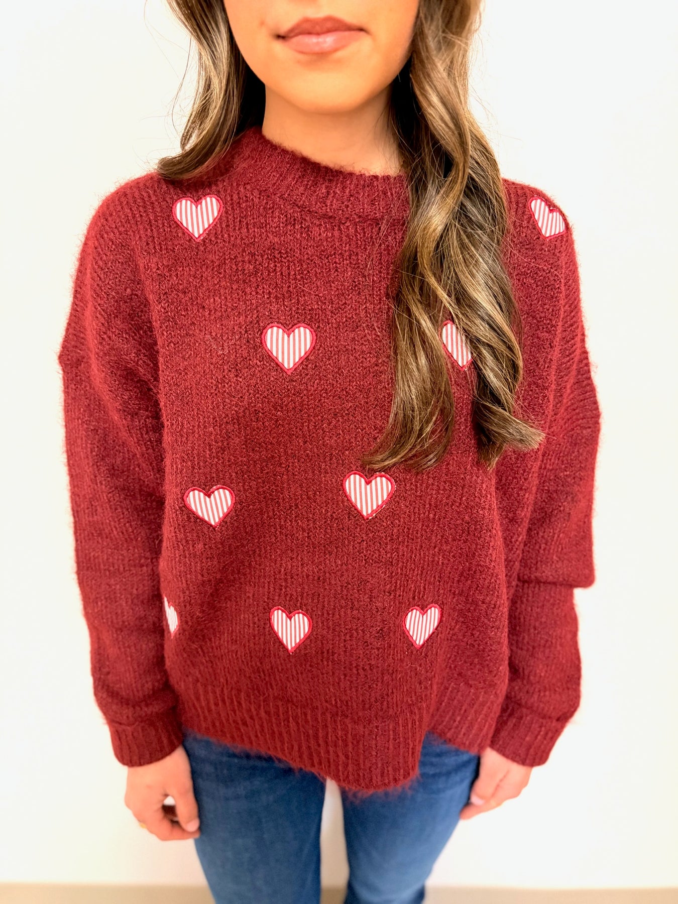 Cozy up in timeless style with this Burgundy Hearts Sweater, featuring charming striped hearts that add a playful touch to your everyday wardrobe. The rich burgundy hue pairs beautifully with any outfit, while the soft knit fabric keeps you warm and comfortable all season long. Perfect for layering or wearing solo, this sweater brings effortless elegance and a hint of romance to your closet. A versatile piece that transitions seamlessly from casual days to special occasions.